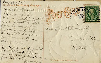 A one-cent stamp, hand-cancelled at Inwood, on a postcard addressed simply to a loved one in a small town in S. Dak.