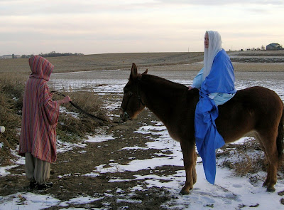 (The “donkey” is actually a mule. Our Joseph here is actually a woman, and the horizon includes farmsteads and power poles. But, you get the idea …)